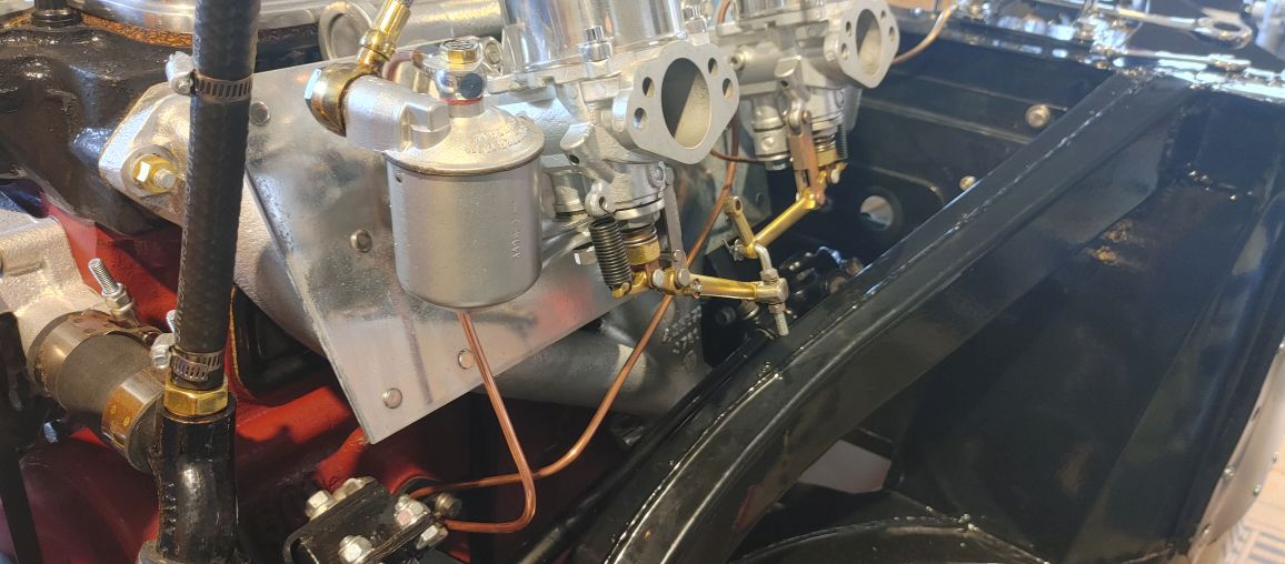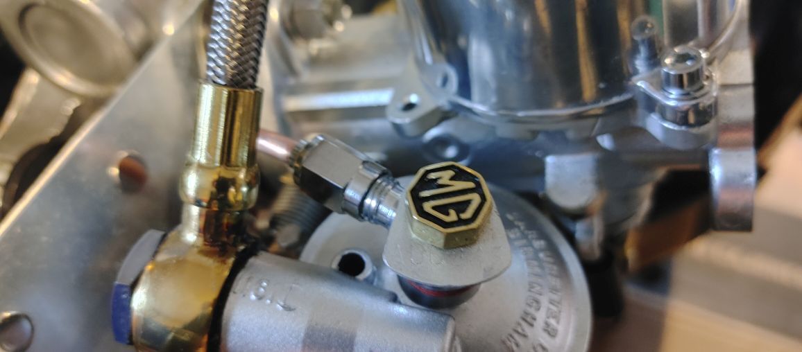 Here is a nifty carburetor modification sent by Paul Millar. The problem is with a fully assembled MGA it is nigh impossibe to get to the P-clip securing the bottom ends of the float chamber vent pipes. So to remove the carburetor you have to disconnect the vent pipe from top of the float chamber, and that leaves the float chamber cover parts loose to fall apart. With this modification you can disconnect the vent pipe from the banjo fitting and leave the float chamber completely assembled.