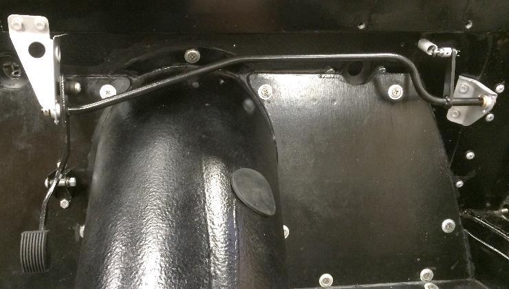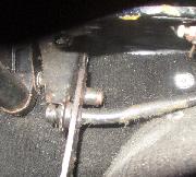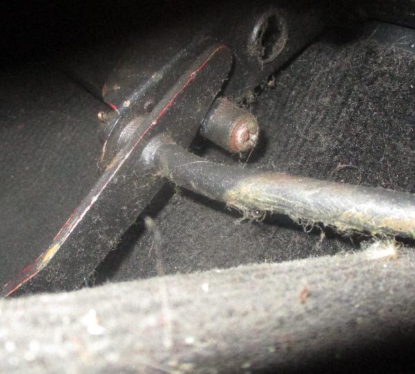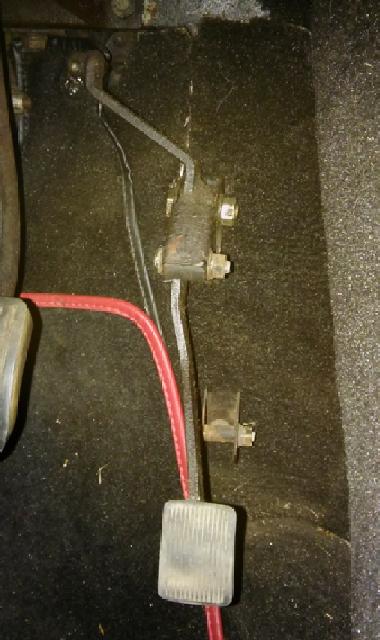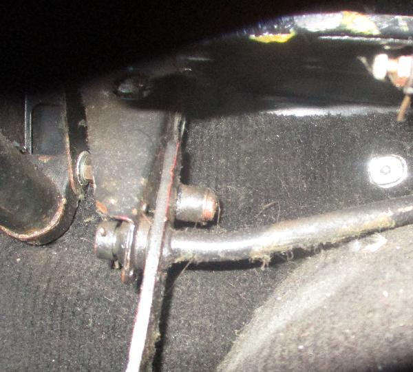Look at the pedal in this position. It should be a little short of hitting the floor. There should be an adjustable pedal stop on the floor underneath the pedal. Loosen the bolt and bring the stop up against the bottom of the pedal when the throttle is full open,