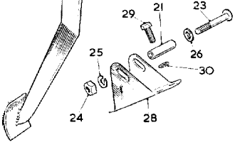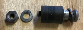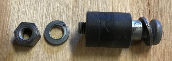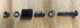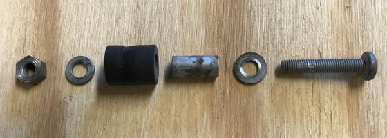 "There are 6 pieces in the stop assembly. One screw 1/4"-28 x 1-3/8" Pozidriv pan head (1-1/2" will work). One 1/4" flat washer. One distance piece 3/4" long with a rubber sleeve. One lock washer and one 1/4-28 nut".