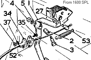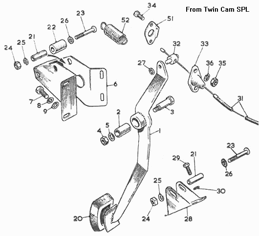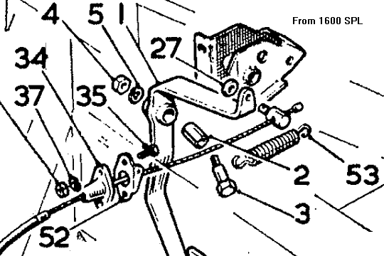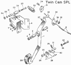 The supplementary return spring attached to the throttle arm (along with associated bulkhead bracket and change of trunnion) was used commencing with car number 24594. Illustrations taken from the Service Parts Lists (click for larger images) are not entirely correct, but 1600 shows the correct spring bracket, and Twin Cam shows the correct trunnion with extended outboard end to accept the spring. It is recommended that these parts should be retrofit to earlier cars.