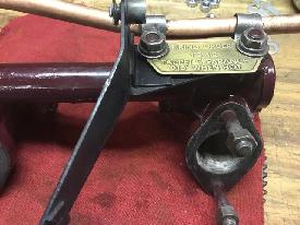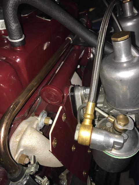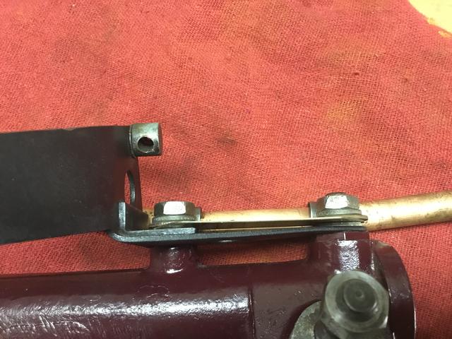 The bracket for throttle and choke cables was painted black, as it was to be installed later. Two "P" clips holding the heater water return pipe go on next (if the car has a heater). The brass tag for Firing Order and Valve Clearance is placed on top of the "P" clips if present, otherwise directly on top of the throttle bracket. The plate sits at a bit of an angle due to a step in the bracket weldment. This assembly is finished with flat washers, lock washers, and thin jam nuts.