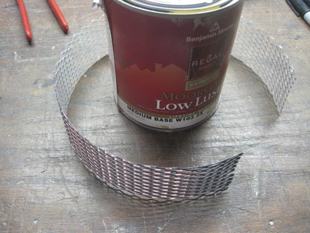 First I cut two strips of the mesh to the correct width, pre-bent them around a quart paint can, overlapping one cell width to the correct screen diameter, nesting the cells, and welding them with a low temperature welding rod using a propane torch. The welding sort of works and you have to be very careful with the heat or you will melt the thin aluminum mesh (ask me how I know). Then I spray painted them with dull aluminum paint.
