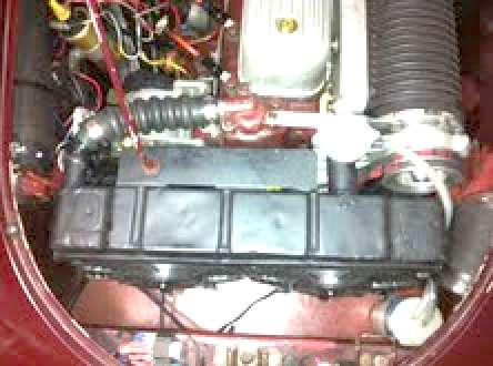 "See also the twin 9-inch fans I put in my car, thermo controlled (you can just see the control unit under the hose on the left). The fans turn off when the ignition is turned off. One cautionary note: after I installed the fans I was having flat battery problems, even when stopping during a drive. I have replaced the original generator with an alternator, and battery problems have disappeared.