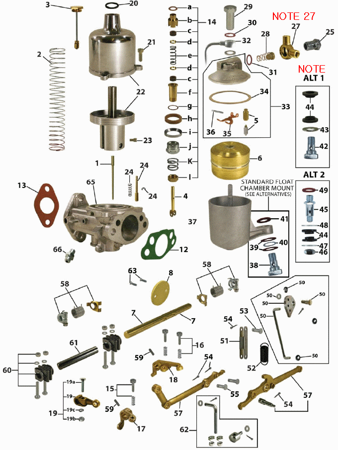 Don't let the illustration at right get you flustered. While there are a lot of small parts here, there are only a few moving parts in the SU carburetor, so it is functionally simple and easy enough to service.