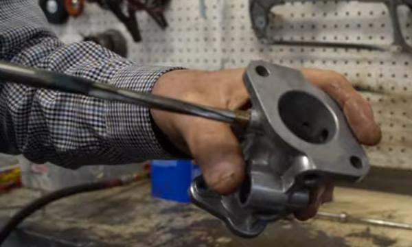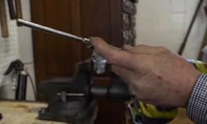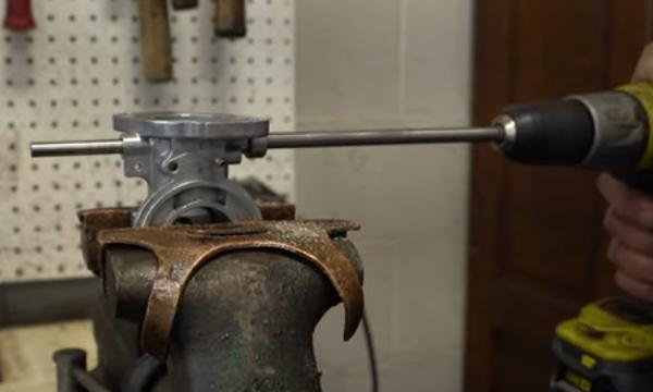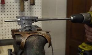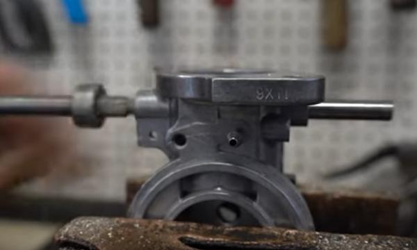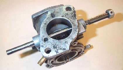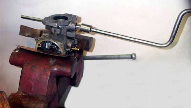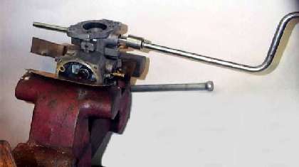 Clean the carburetor body with solvent. Hold the carburetor body securely in a cushioned vise with brass strips cushioning it. Pass the shaft through the body into the hole on the other side. Turn the reamer “backward” by hand, reaming the near side, withdrawing frequently to remove the swarf. Used plenty of cutting oil to avoid dulling the cutting edges. Check fit a bushing, then remove it, smear with thread-lock adhesive and refit. Then ream the remaining journal hole and fit a bush in the same manner. Oil the new bushings. The reamer is guided by the old bushings for the first pass and by the old and one replacement bushing for the second pass.