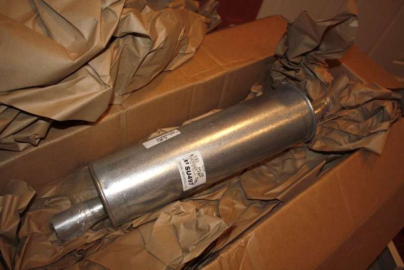 Shiny new muffler fresh from the box.