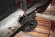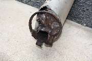The naked end of the exhaust pipe after the muffler came off. If you click to see the bigger version you can see some collateral damage on the underside and coming through from the top of the pipe. Since those will be covered by the end of the muffler, I'm not too concerned. Given the procedure I'm glad and a little surprised it's not worse.