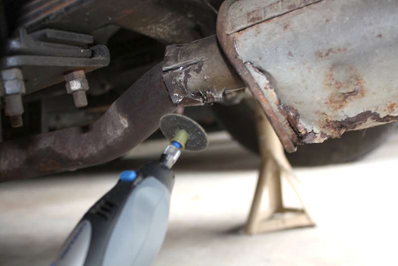 Slicing with the Dremel. Notice the seriously dented muffler now.