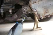 "Navigating a hack saw is tricky as there are things you don't want to accidentally cut, most importantly the brake line and emergency brake cable. Also, laying on your side it is difficult to accurately cut only through the outer pipe (muffler input) without slicing the inner pipe (exhaust from engine). I do the best I can hack sawing and prying metal apart with a screw driver and come up with what I think is a pretty good opening in the outer pipe, pictured below. The joke is on me. After repeating similar procedures as best as possible on the top of the pipe I determine I'm going to need to get more drastic. Are there tricks for getting a stubborn one off without ruining anything? In the end I suspect this will all make me feel better about $300 bucks (and the extra time and effort) to put in stainless next time. Maybe they'll have figured out how to keep the glass pack in by then.