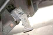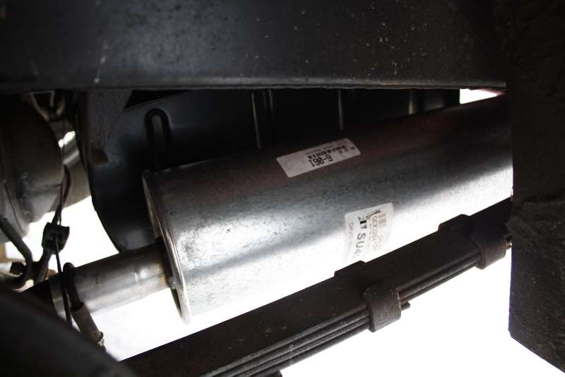 The new muffler from the wheel well. The clamp bracket at the left is back in place. It looks like the hand brake cable now touches or nearly touches the exhaust. That may be because the upstream hanger is broken although it seems like that will make it worse. Hopefully the heat on that cable will not be a problem. So far I can't discern any problem with it dragging.