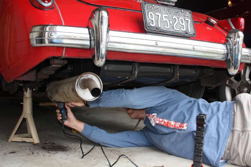 The following photos and notes are supplied by Geoff Howard in Ashburn, VA, USA. He is chronicling his trials and tribulations at replacing the MGA muffler.