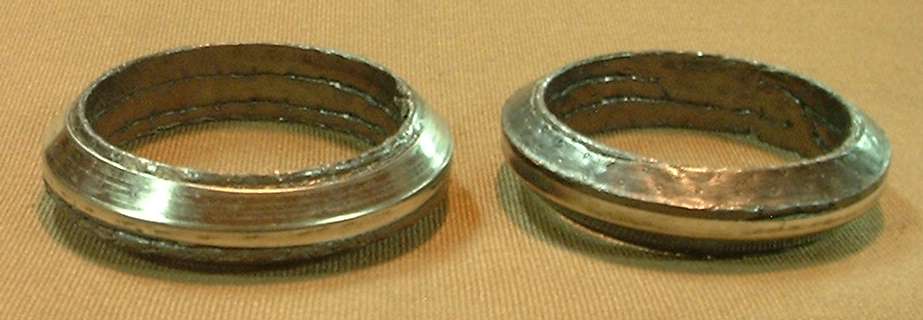 The donut shape sealing ring between the pipe flange and the iron manifold will often have a metal cover on one side and uncovered fiber surface on the other side. This begs the question, which side up? I don't suppose it makes much difference either way. I wouldn't get into any argument about it. John Twist recommends mating the fiber side to the iron manifold and the metal side against the pipe flange (but I still don't know why). Some other cars (notably transverse engine front wheel drive) have a flexible joint here, in which case the metal side goes against the exhaust pipe to tolerate the motion. Perhaps that is the only reason the donut seal has a metal side (for those other applications).