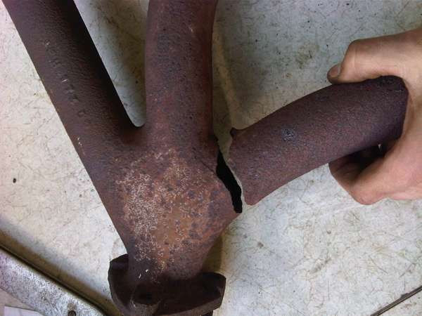 A crack at the "Y" junction has a rather odd origin. Heat cycling of the manifold causes it to change shape slightly over time. The outer arms eventually get closer together, so the two end manifold bolt holes will not line up properly. You may find it difficult to remove or reinstall the manifold over the two end studs. This misfit will cause stress that can lead to cracking of the manifold at the "Y" junction. If you find this shrinkage, use a rat tail file to elongate the end holes in the manifold to achieve a free sliding fit on the end studs for installation. And if you have to do it again five years later, so be it. I believe later production manifolds have an addition thin web cast between the arms to inhibit such cracking. I do not know if this reduces the shrinkage problem, but it should reduce the tendency to break.