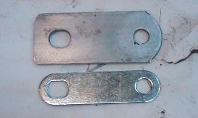 Photo below is original style parts. The short strap is 3/4" wide x 2-3/4" long x 0.075" thick (same 14-gauge steel used for most of the MGA chassis frame) with 11/32" holes 2" center to center. The long strap is 3/4" wide x 7-5/16" long x 0.075" thick with with 11/32" holes 6-9/16" center to center. The slotted hole is to allow for mislignment of the welded bracket on the pipe.