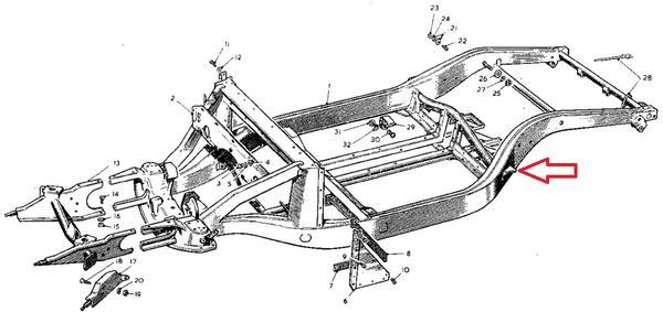 These pictures show the perimeter frame that runs along the sides below the door sills, just inboard of the rocker panels. Place your hoist pads under the horizontal part of the frame here, one pad forward just before the frame turns inward and upward, the other pad rearward just before the frame turns inward and upward.