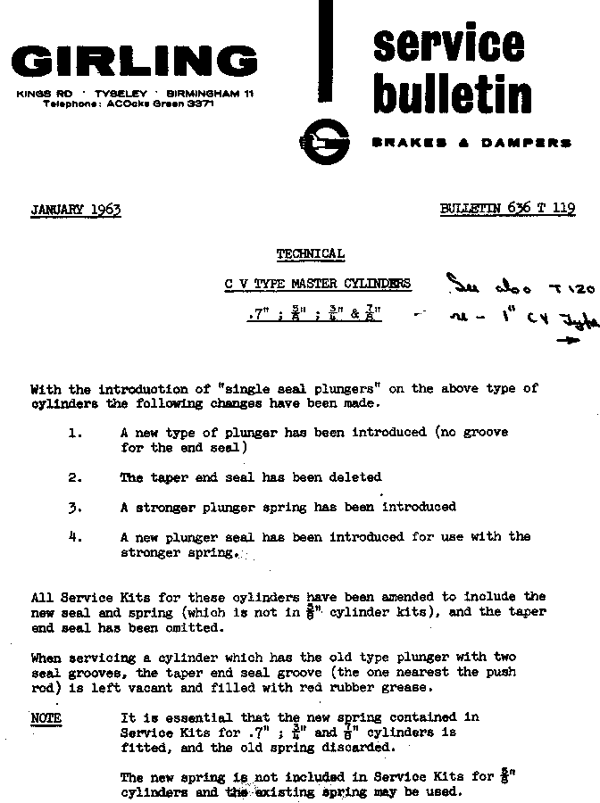 This service bulletin from Girling in January 1963 affects the clutch master cylinder for MGA Twin Cam and "Deluxe" cars. Click for larger image.