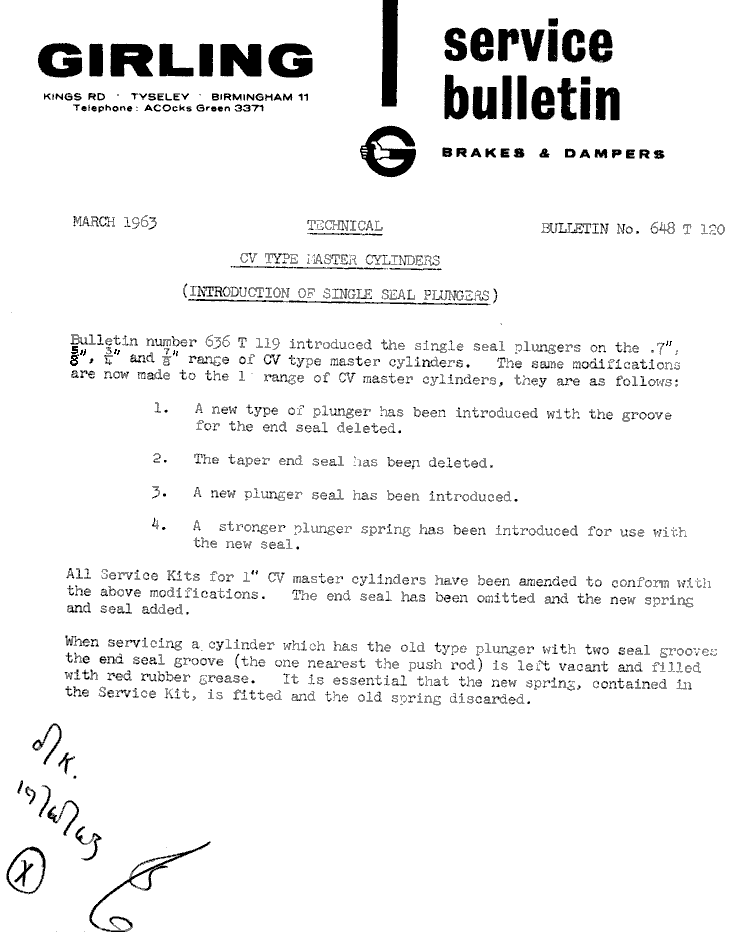 This service bulletin from Girling in March 1963 affects 1-inch bore CY type master cylinders. Click for larger image.