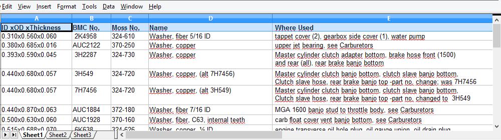 I often have problems with small sealing washers falling out of their designated baggies and becoming lost or loose and unidentifiable. There are also occasions when I need a seal washer I don't have in hand, and it is a royal PITA to have to place a parts order and wait (especially when minimum shipping charge is more than the cost of the part). So I have compiled this list of every copper and fiber sealing washer used in the MGA (and common to some other cars as well). It is listed first in order of sizes, ID x OD x Thickness so you identify a loose part with corresponding part numbers and where it is used. It should also help to find a part at a local hardware or auto parts store. Immediately following is a spread sheet copy (click to download) that you can sort in order of part numbers (or any other way you like) .
