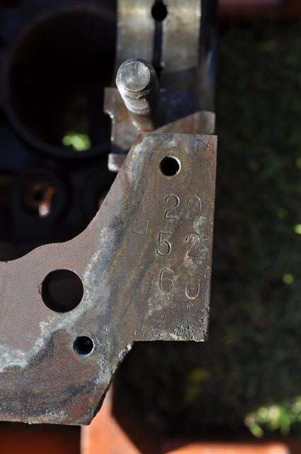 Australian regulations required the engine number to be stamped on the engine block, so the original UK factory riveted tag was removed, and the number was stamped on the casting in the same location. These photos also show the serial number part of the engine number stamped into the rear of the block (although I can't say if they were all done that way). Numbers stamped on the bottom of the block near the front corner (20 52 60) are partially under the sump gasket, so had to be stamped before the sump was installed. My best guess is these numbers are a batch and serial number (within the batch) and year of production, most likely stamped on the finished machined casting before any assembly work (before an engine serial number was assigned). If so, these numbers would be irrelevant, unless someone tried to re-stamp an incorrect engine serial number that did not match the machining production date range).
