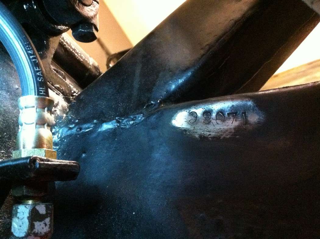 Chassis number on frame, before and after cleaning off the paint. Find this (if it is there) on outboard side of frame after removing left front wheel. If it was originally stamped there but is now obscured, you may find a horizontal dent in the frame about 2-inches long. Not all Aussie CKDs were stamped there but they were all stamped with their BMC chassis number and the Aussie build number up on the heater shelf very close to the end of the solid fuel line.