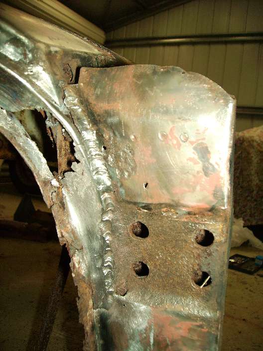On a car I am building for myself I removed the bonnet shroud to repair it and found the bulkhead panel that has the heater opening had not been spot welded to the inner guards on its vertical edge or on the edges at the top where it sits under the reinforcing brace. It was only spot welded along its horizontal edge to the inner guard. You can see in the other photo where I have put a few plug welds with the MIG in place of the missing spot welds. On my twin cam it is spot welded in that area. That particular car didn’t have that many spot welds holding the bonnet shroud to the inner guards along the edges.
