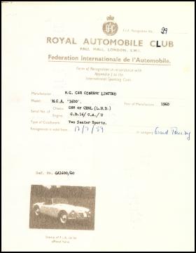 This is the homologation documentation for the MGA 1600 as a production model, issued in September 1959 by "Federaton Internationale de l'Automobile".