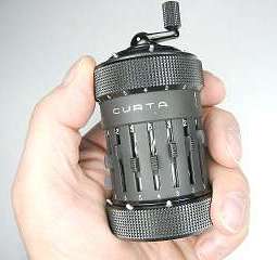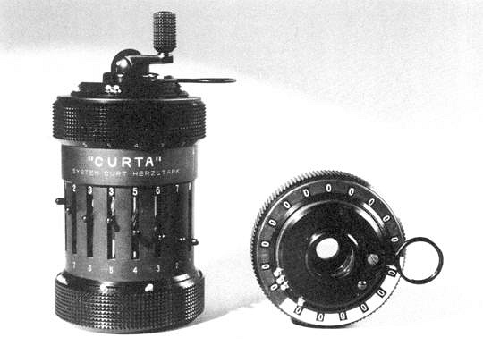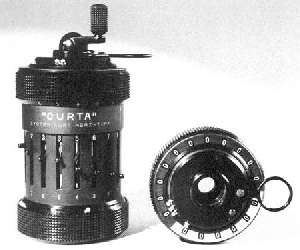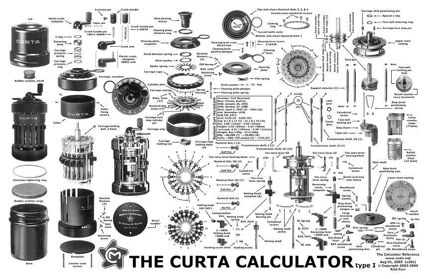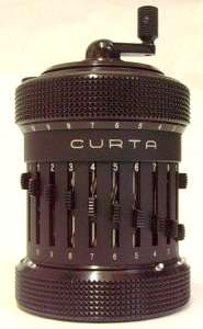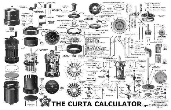 This little jewel of technology should boggle your mind. The purely mechanical device can add, subtract, multiply and divide. Curta Calculators were a post WW-II device commonly uses for calculations during Time-Speed-Distance (TSD) road rally. They are still used today for vintage rally where only mechanical clocks and mechanical calculators are allowed. It is a universal 4-function calculator that will literally fit in your pocket, that is, a mechanical pocket calculator, no battery and no computer chip. The user manual is called "Your Curta Calculator", a 24-page 367-KB pdf file.