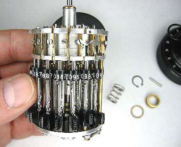 The Curta Calculator was available in two basic models, Model I (8 x 6 x 11 digits) above, and Model II (11 x 8 x 15 digits) below. There were a lot of variations on style and trim, but they all work the same. Set the primary number on slides on the side and give it one crank. Lift the carriage on top and turn it to the desired power of 10, and crank away. Crank is in lower position for addition and multiplication. Crank is in raised position for subtraction or division. The ring loop on top is the clearing handle. Raise carriage and move clearing handle through one sector, white, black, or both to clear all.
