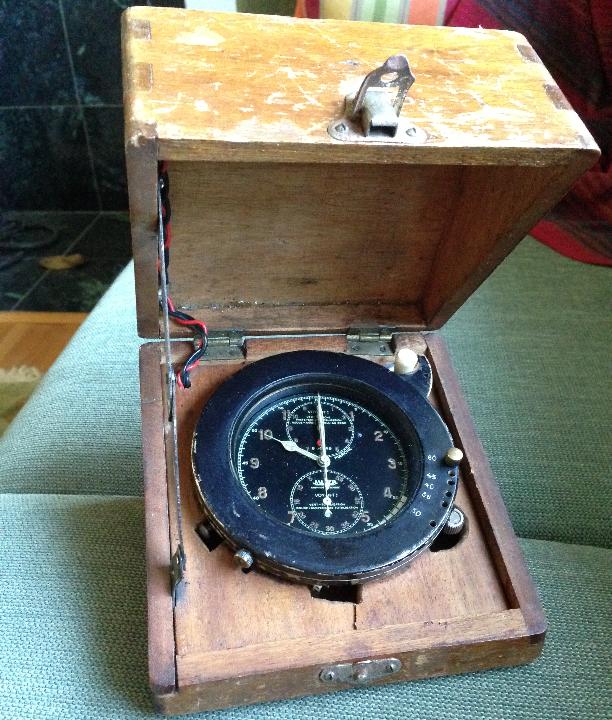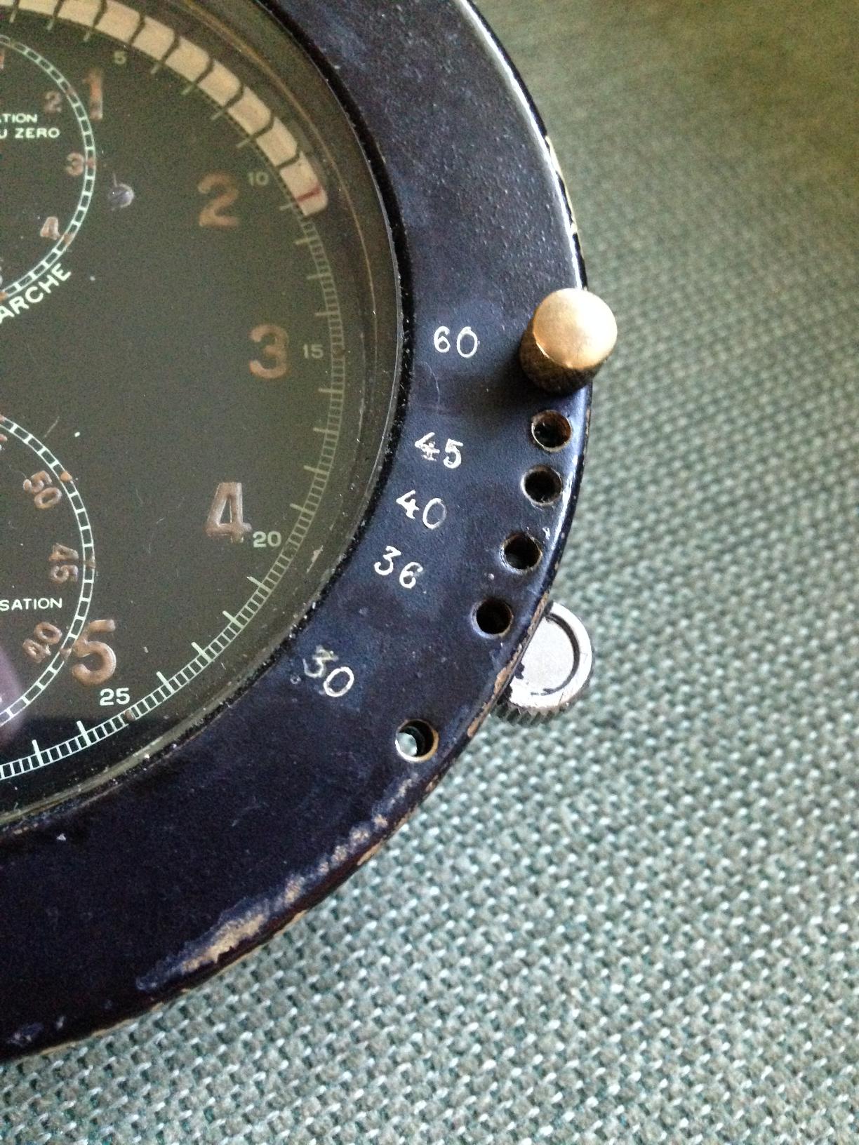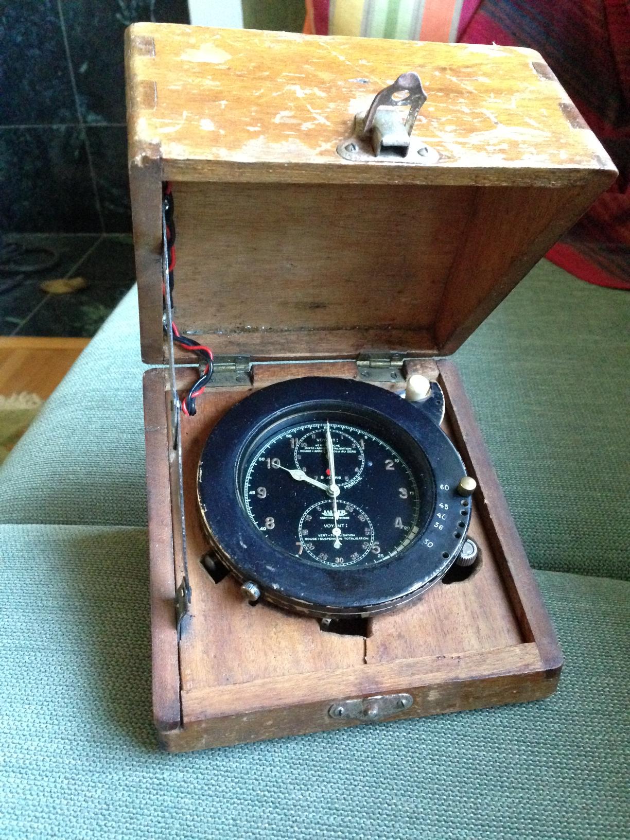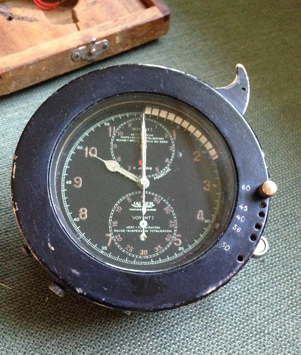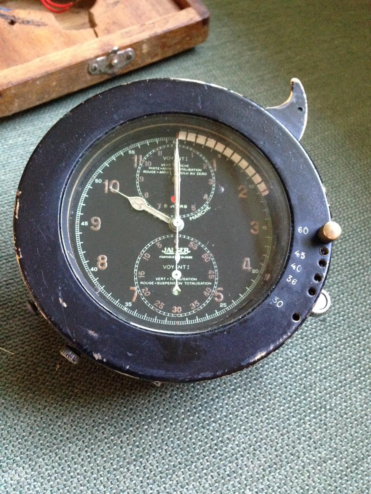 "I have the clock in the photos which appears to be a Jaeger 8-day aircraft clock that has been modified for road rally use in the 1930s".