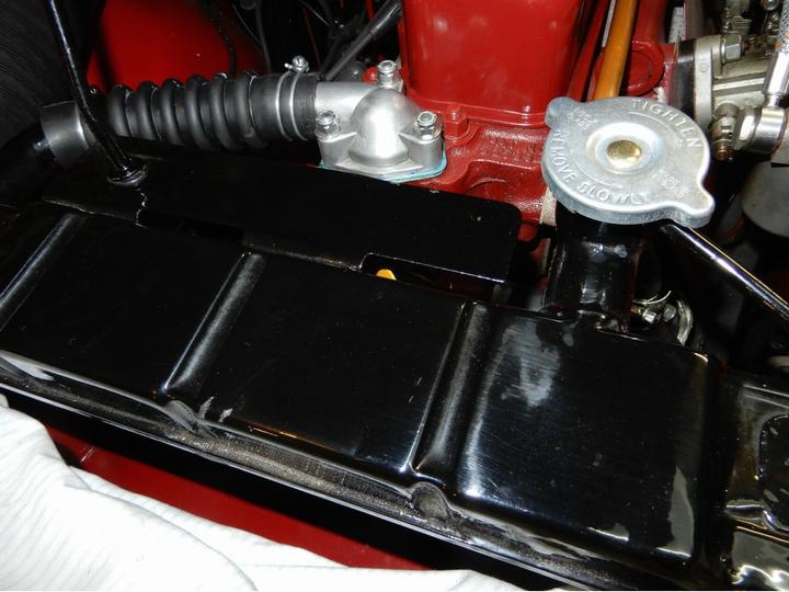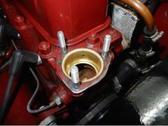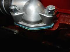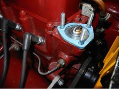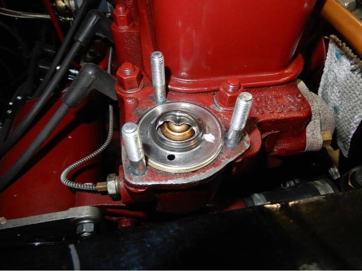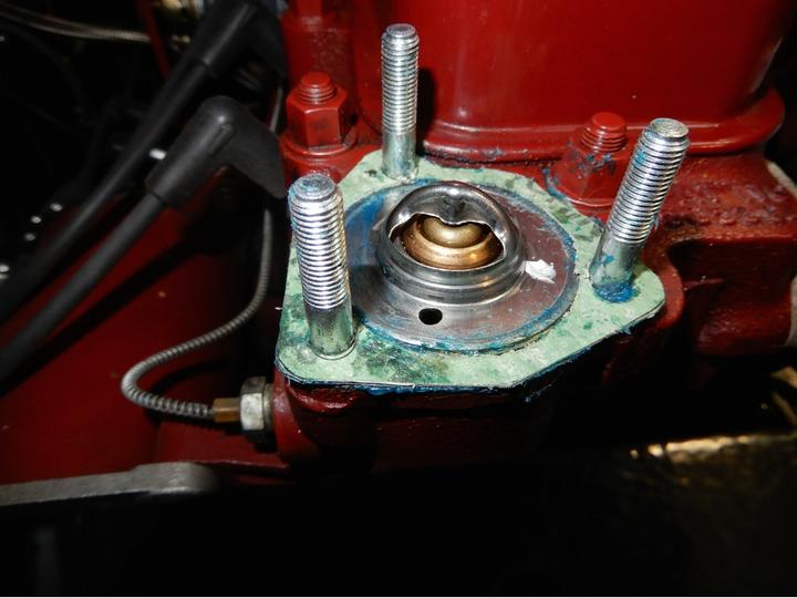 For those who may want to use the thermostat blanking sleeve and a modern thermostat together, there are a couple of issues to pay attention to. First, very recent issue blanking sleeves may be a bit oversize on diameter of the top flange. This requires grinding a bit off the edge of the flange to get the sleeve to fit down into the counterbored recess in the cylinder head. That may be enough to assemble this combination properly if you use a soft cork gasket. --- Placing the thermostat on top of the blanking sleeve flange makes double thickness, so the thermostat flange protrudes slightly above the cylinder head surface. A modern Klingersil hard paper gasket may not squeeze down enough, leaving a small gap under the bottom of the the thermostat cover.