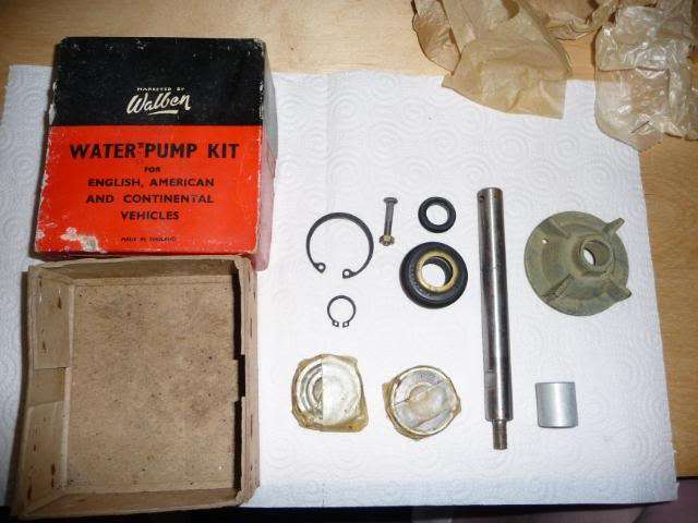 Illustration at right is the early model water pump with two bearings with a shaft spacer in between. Photo below is a rebuild kit for this unit. The kit has been excessively rare and hard to find in recent years.