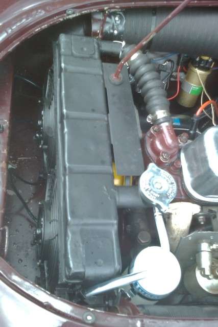 "At bottom of pic you can see the Tudor plastic atmos overflow bottle. Its cradle is connected to a small bracket bolted to the radiator mounting flange. Water flowed in and out of bottle. Now need a really hot day"!