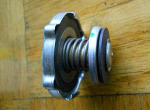 For the purpose of installing the coolant recovery system, the pressure cap DOES need to have an absolute seal at the top of the filler neck, because it has to be able to create a slight vacuum to draw fluid back into the radiator when the system cools down. You will notice in the picture at right that the top diaphragm in the cap has a thin rubber seal around the edge. This is not included on the original MGA radiator cap. It was not used much prior to 1968 (when radiators had shorter necks), so the demand is only for aftermarket conversions on older cars.
