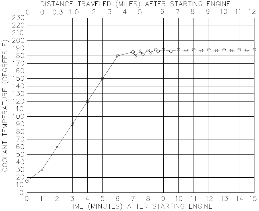 The car was parked outside for 24 hours (6:30pm to 6:30pm) prior to this test. Low temperature night before was 8dF, daytime high was 20dF. Ambient temperature at time of this test (two hours after sunset) was 15dF with a regular light breeze around the car. We then have a 15dF cold start, and one minute of fast idle to reduce choke appropriately. Then back out of driveway, a 2-block slow drive, right turn at a traffic light, and run up an entrance ramp onto expressway. Progress from there is generally steady 55 to 60 mph, never exceeding 1/2 throttle or 3500 rpm engine speed. At 5 miles there is slight slow down (40 mph x 1/2 mile) for interchange to another expressway. This accounts for the relationship between time and distance on the graph. In short, the car is being driven casually under normal load during warm up, not idling.