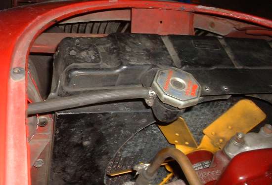 The final step is to connect the recovery hose to the original overflow tube on the radiator. The picture here shows the original steel tube cut short with the hose connected right at the filler neck. You do not have to cut the original steel overflow pipe. The hose can just as well be connected at the bottom end of the original pipe, as long as that pipe and all the connections are air tight to provide for drawing fluid back into the radiator with a slight vacuum.