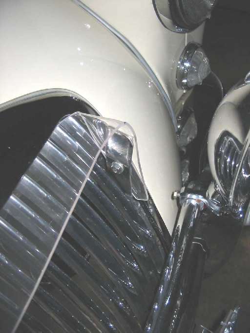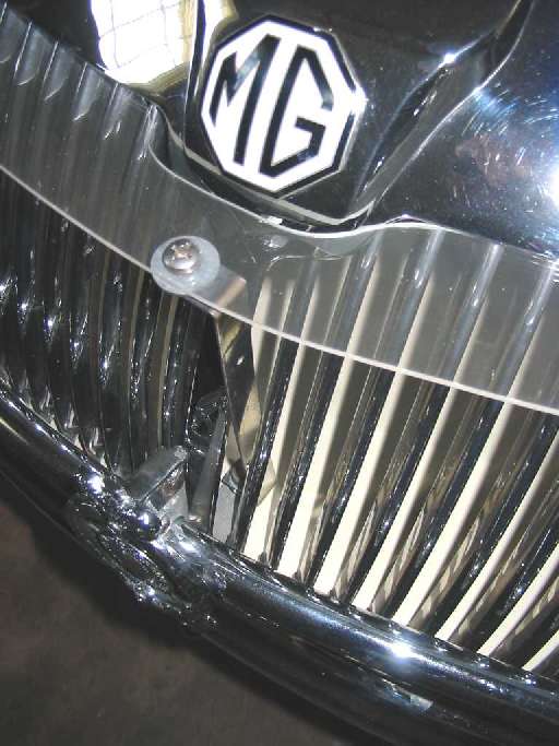 Here are some photos of the air deflector. I was put on to this idea by John Rubel at the 2006 Gatlinburg All-MG Meet, and have taken his version a bit further. Whereas his material was 1/4" Plexiglas, I chose to make mine out of thinner but tougher 0.090 Lucite-Tuf, which is Lexan like in performance, yet which still bends with a hot air gun and costs much less money.