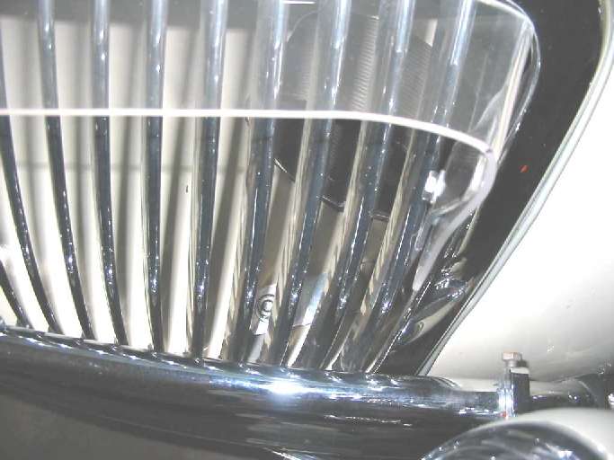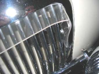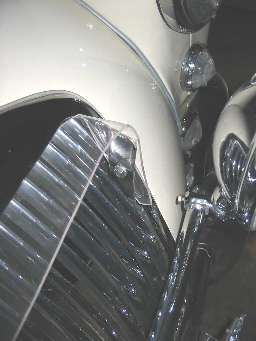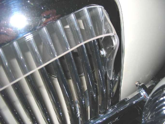 John was able to wedge his device between the side-most slats and the shell. I could foresee two problems: Firstly, the risk of damage to my original shell was unacceptable, and I worried that any unsecured device in the air stream might become a projectile. The Lucite-Tuf tucks under the bezel along 7/8ths of each side until it nears the side or center mullion. There, the plastic is made to clear the chrome at the turn-downs or where it arcs across under the MG medallion.