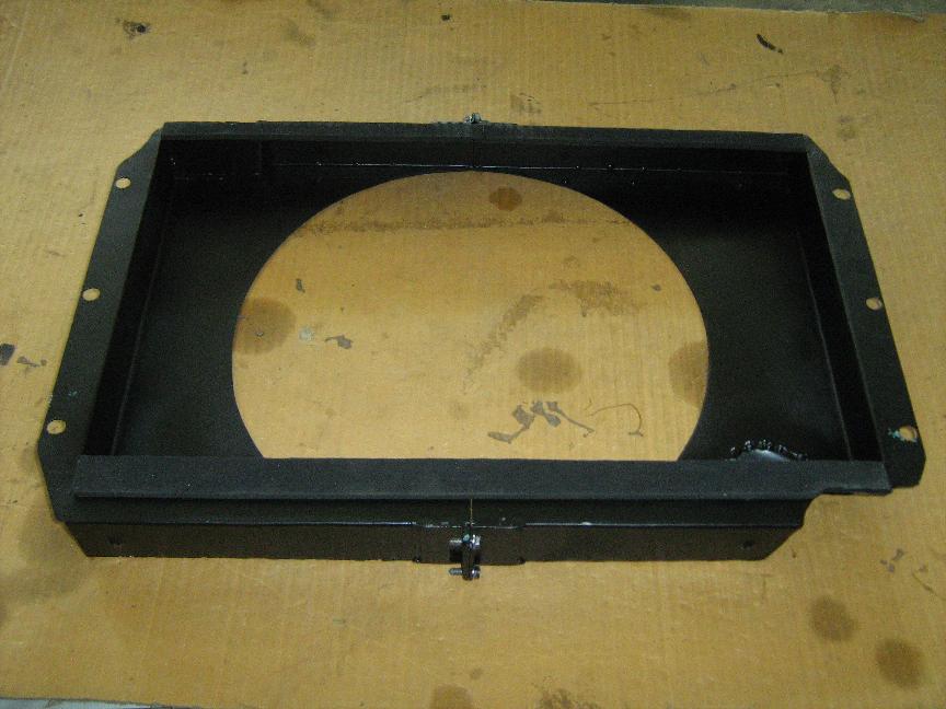 The components were zinc primed and tack welded together. Then a 150mm diameter hole was cut on the pump spindle centers to clear the pulley boss. A trial fit allowed the aperture for the fan to be marked on the rear of the shroud using a wooden radius arm with a notch at one end and a stub of pencil embedded in the other. Radius was 161mm and the aperture was cut out. A 4mm dia drainage hole was drilled and swaged at each side of the bottom channel.