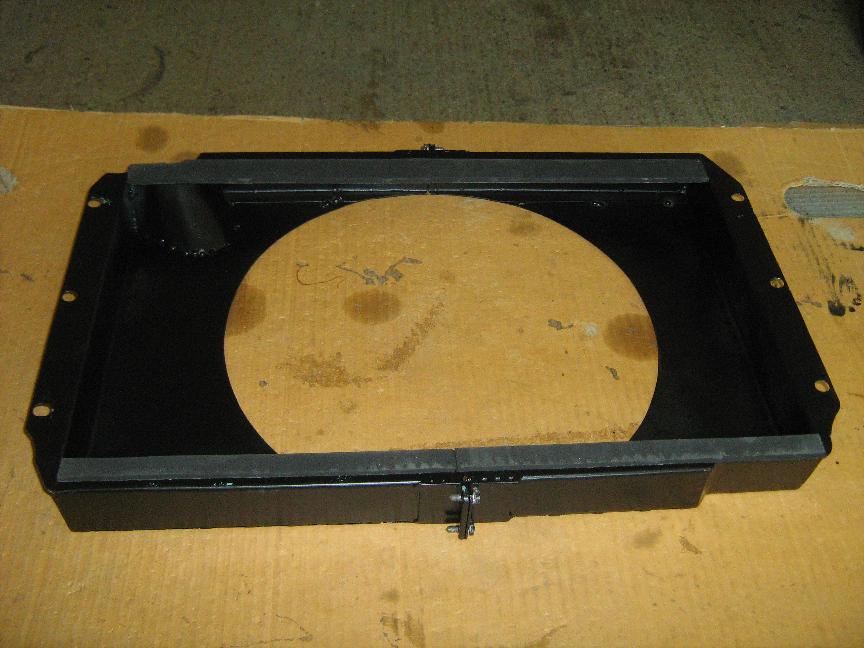 On the basis that the shroud is in one piece, it comprises three folded panels, a center piece folded to fix in front of the radiator support, a top U channel and a bottom U channel. The return folds in the channels are dimensioned to align with the inside edges of the soldered matrix joint without obstructing air flow, all as shown in the drawing above.