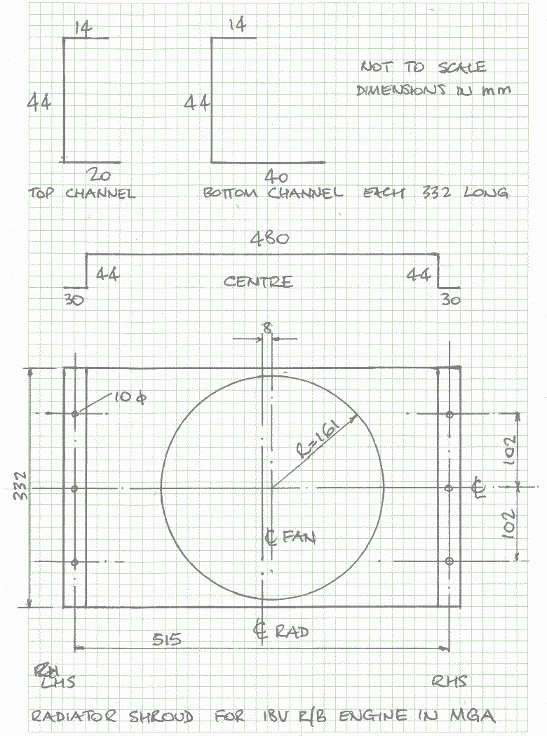 The width of the shroud is fixed by the distance between the vertical edges of the rad support. On my car that was a minimum of 482mm so I fixed the width at 480mm. Fixing bolt centers are 514mm horizontally and 102mm vertically above and below the center line.
