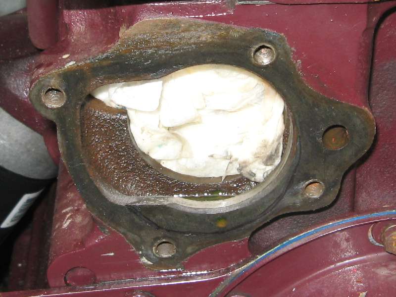 These photos and notes come from out friend Tom Baker, currently residing in Japan. He is the only person I know who has done this modification (but there could be others). He had procured a supercharger kit that came with a water pump from an MGB five main bearing engine, so decided to take the plunge and modify the MGA engine block to accept the larger impellor. While the four attachment bolts are in the same location on 3-main and 5-main blocks, the later and larger impellor is positioned lower and slightly off center from the early one. This then requires removal of a lot of iron around the bottom of the opening and not so much at top. With the later impellor being deeper, it also requires removal of iron from the web near the back of the opening on the early MGA blocks.