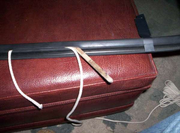 I chose a particular type of rope (from Rona hardware) that is the type used for draperies and blinds. It is about 1/4 in wide but most importantly is a woven type of cord not spiral wrapped. The importance of this will be shown later. Also be sure that your rope is of an adequate thickness. If it is too flimsy, it will break when pulled and if it is too narrow, it will tear the rubber seal edge as you pull on it.