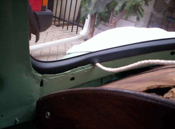 By now you should have the lower portion of the seal and windshield installed with both outer side pieces installed and are now moving on to the top portion of the seal. This will be the easy part as most of the glass is fitted. Working from both sides (right & left) pull the cord.. Fit the outer edge of the seal and the inner edge. As you come to the final foot of installation you will notice the seal getting bunched up and harder to pull over the lip. Keep going but very slowly so as not to tear the seal.