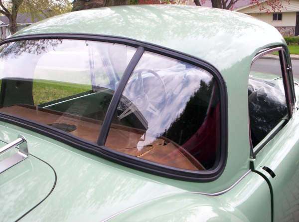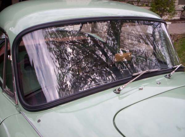 Proceed to the front windshield where the same procedures will be applied. There is no need to explain the full procedure as it mimics the rear installation. If you have been able to do the rear fitting, the front windshield will be "a piece of cake". On the Coupe, a word of caution.... DO NOT install the front windshield until you have glued down the vinyl cover on the upper dashboard and installed the defrost vents. If you install the windshield before fitting those pieces it will be "pure hell" to get them fitted after the windshield is in.