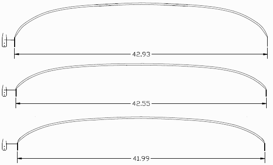 Since new MGA Coupe headliner bows are not available you might want to make your own. Here is a preliminary drawing (subject to change). Dimensions are in inches. Click for a larger PDF image. If you can print it to scale you can use it as a template for forming the new parts.