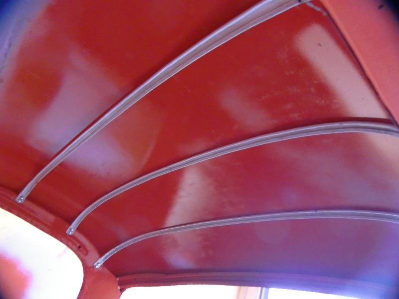 "I used the lining from Moss, and to get a proper fit I had the arcs following (close) the roof line (except for the last ~4”). I think I had to shorten the front one by moving the holes ~10 mm on one side, still having the arc following the roof line. They were made by curtain rods which was first flattened a bit in the vice, then used wood formers to get it close to the original".
