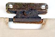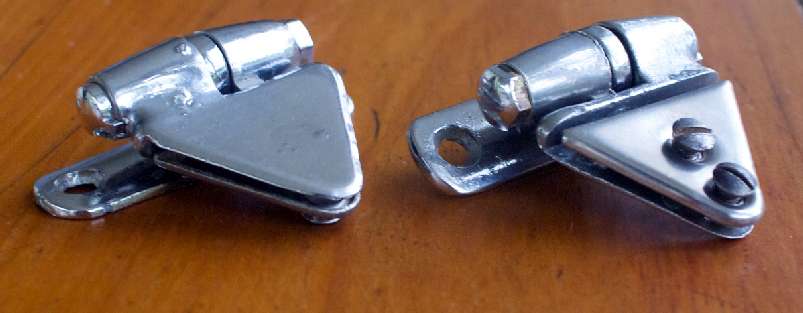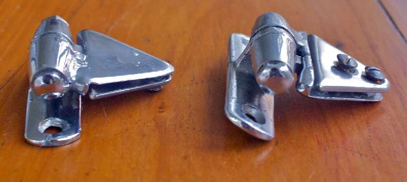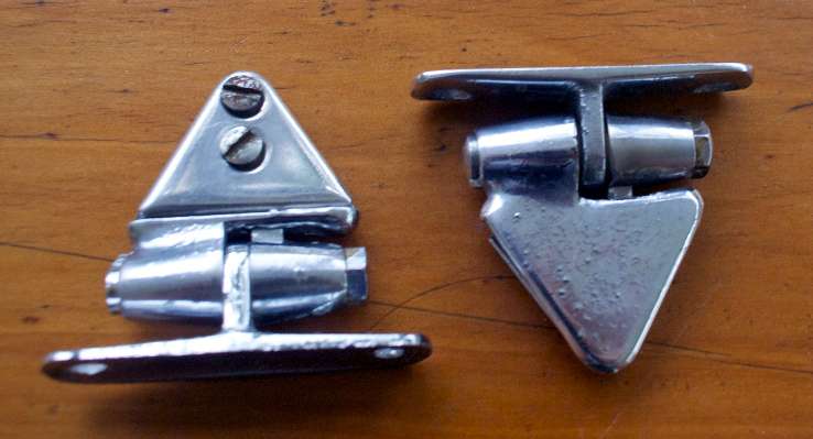 Bear in mind the photo at right is what we're after for original appearance. Photos below are courtesy of Mark Wellard in Australia. These triangular hinges come from an MG Y-type and appear to be the same parts used for the MGA Coupe. Aside from the hinges, the Y-type visors are NOT the same as MGA parts.