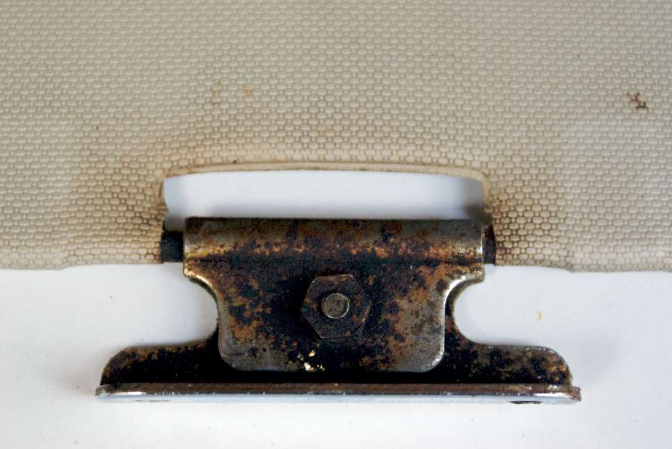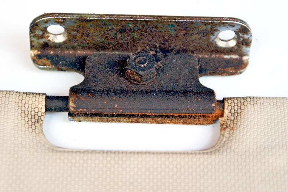 Others have suggested that an Austin A30 visor is also the same as an MGA coupe, but not so. See pictures below. They have a plastic-welded or heat-sealed edge and are made with the same material as used in the MGA coupe headlining. They would make a suitable visor for the coupe because of the headlining match (if you still have the correct material), however, the hinges are totally different.