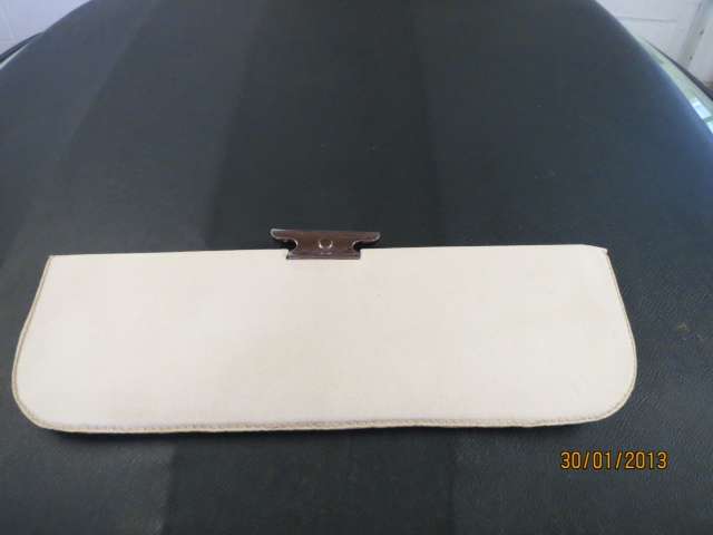 "The photo of the sun visor is attached. [See below]. I can confirm with certainty that the holes in the bracket fits the mounting holes in 554 [Twin Cam coupe] exactly – 554 was fitted from the factory with one sun visor, and it did not have a triangular bracket with 3 screws. The sun visor also looks much the same as the illustration in both the 1600 and Twin Cam SPL".