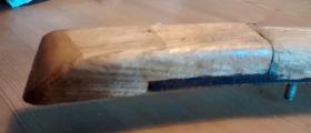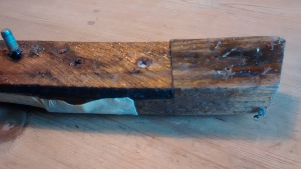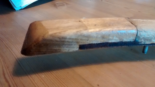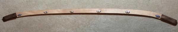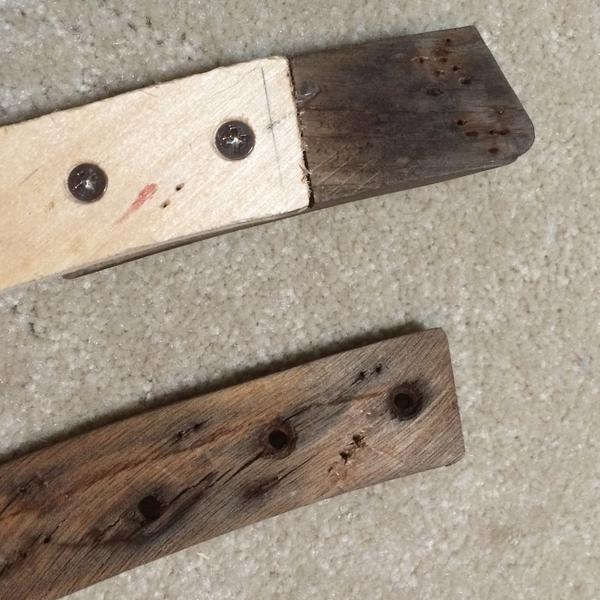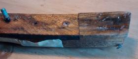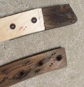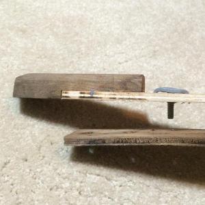 "The first one, you can see the wooden block at the end overlapping the ply strip. The piece on the right is the rubber pad, covered by sticky tape. The second one shows the back, with one of the screw pins in sight.